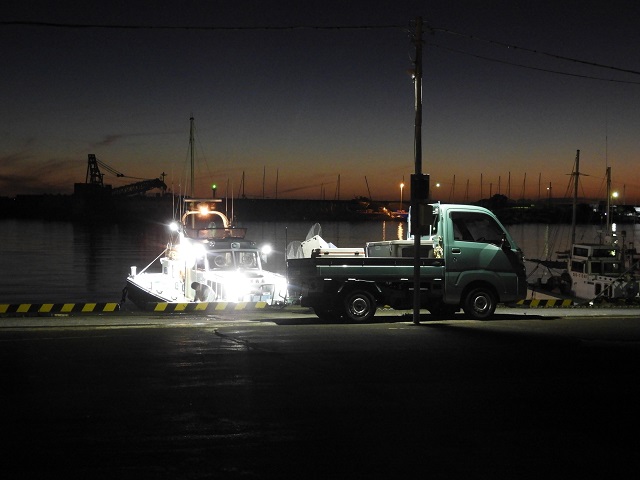 朝、暗いときに道路側から船を見るとこんな感じです!