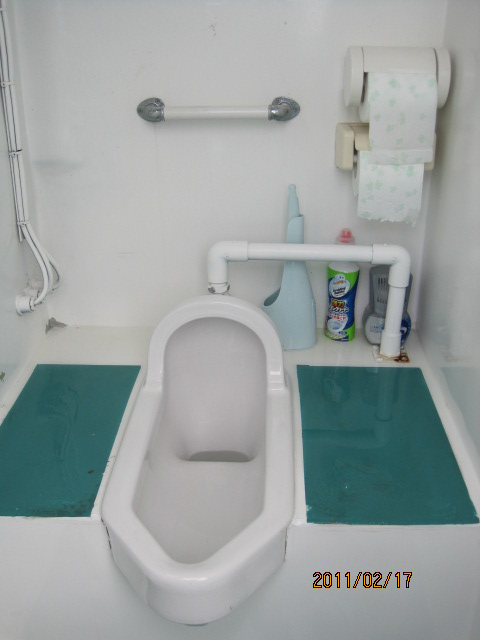 船のトイレです!上着を脱いでもコートフックに掛けることができます(右)